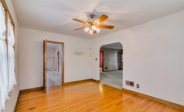 Just adjacent to the living room we find the 15 x 11 dining room, featuring wood floors, ceiling fan, and bright windows! Gather friends and family for holiday meals or use this space as an office, play space, or additional sitting area.