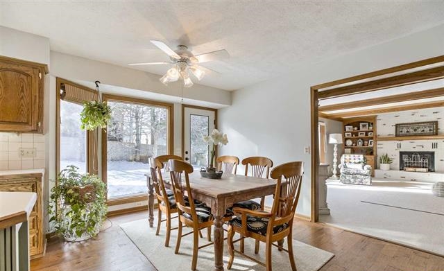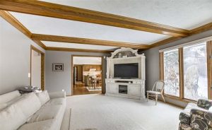 Step into the beautiful main floor living room and be immersed in the sweeping view of this home’s lovely backyard! Enjoy the flickering warmth of the fireplace during these cold winter nights (and days). And how about that beamed ceiling for added drama! We love it!