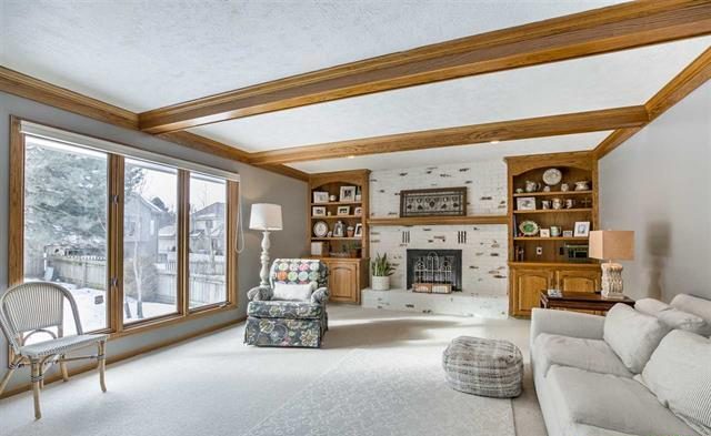 Step into the beautiful main floor living room and be immersed in the sweeping view of this home’s lovely backyard! Enjoy the flickering warmth of the fireplace during these cold winter nights (and days). And how about that beamed ceiling for added drama! We love it!