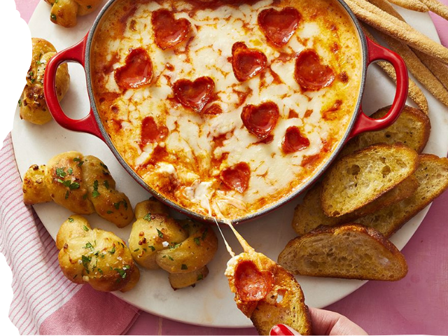 Warm, spicy, cheesy, and sharable! The only thing that could make this recipe more Valentine’s Day appropriate is the cute heart shaped pepperoni. Get your favorite dip-ables and your favorite people together and give this a try!