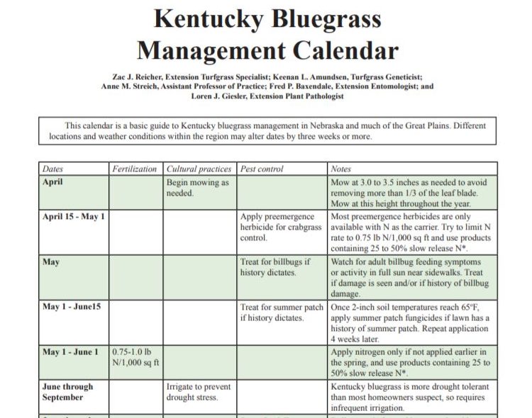 As you can see from the Kentucky Bluegrass Management Calendar provided by the University of Nebraska-Lincoln Extension office, we should be on our second fertilizer application, applied in June. The third fertilizer application will occur around Labor Day, as our temperatures start too cool.